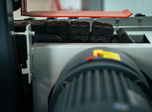 Перемещение детали во время цикла происходит при помощи транспортера промышленного исполнения, который состоит из цепного привода и обрезиненных подушек (башмаков).